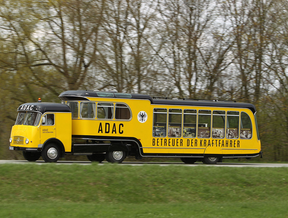 Das Unternehmen Cleff hat für den Fahrzeughersteller Gottlob Auwärter bereits in den Wirtschaftswunderjahren zahlreiche Fahrzeuge mit Fenstern ausgestattet. Der Sattelauflieger des „gelben Riesen“ (12 Metern Länge und 2,5 Meter Breite) bot Raum für einen Konferenz- und Sitzungsraum, einen Büroraum mit kleiner Küche und einen Kundenbereich mit Theke. Zugfahrzeug war ein Mercedes-Benz LPS 328/36 (5.070 ccm-Sechszylinder-Motor mit 110 PS) und der Sattelzug diente als mobile ADAC-Geschäftsstelle. Neben einem 220-Volt-Bordnetz mit Wechselstromaggregat und Notstrom-Batterien, verfügte er über seinerzeit modernste Kommunikationstechnik wie z.B. eine Telefonanlage, ein Lautsprechersystem auf dem Dach, das mit einem Philips-Tonbandgerät, einem Plattenspieler und einem Mikrofon verbunden war. Fast zehn Jahre lang war das Fahrzeug im Dienst des ADAC auf Messen, Ausstellungen und Sportveranstaltungen in Südbayern unterwegs, um ADAC-Mitglieder zu betreuen und um ihnen Seh- und Reaktionstests anzubieten. 1971 wurde er schließlich verkauft und nach weiteren 30 Jahren stillgelegt. Aber nur vorläufig … denn von 2010 bis 2012 erfolgte die aufwändige Komplettrestaurierung des inzwischen zum Note-5-Wrack „gereiften” Sattelzugs – und diese Restaurierung hat unser Unternehmen hinsichtlich der Befensterung gerne begleitet.
